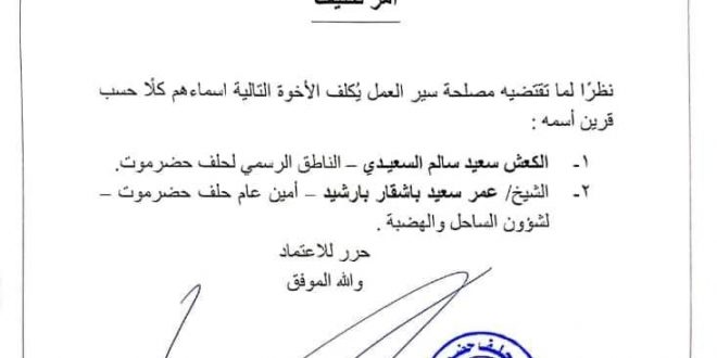 المكلا /١٢ ابريل ٢٠٢٠ أصدر الشيخ عمرو بن حبريش العليي رئيس حلف حضرموت، اليوم "الأحد" قرارًا يقضى بتكليف كلًا من : - الكعش سعيد سالم السعيدي - ناطقًا رسميًا لحلف حضرموت. - الشيخ /عمر سعيد باشقار بارشيد - أمينًا عامًا لحلف حضرموت لشؤون الساحل والهضبة.
