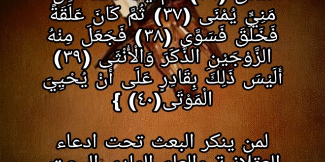 (أَيَحْسَبُ الْإِنْسَانُ أَنْ يُتْرَكَ سُدًى (36) أَلَمْ يَكُ نُطْفَةً مِنْ مَنِيٍّ يُمْنَى (37) ثُمَّ كَانَ عَلَقَةً فَخَلَقَ فَسَوَّى (38) فَجَعَلَ مِنْهُ الزَّوْجَيْنِ الذَّكَرَ وَالْأُنْثَى (39) أَلَيْسَ ذَلِكَ بِقَادِرٍ عَلَى أَنْ يُحْيِيَ الْمَوْتَى (40)