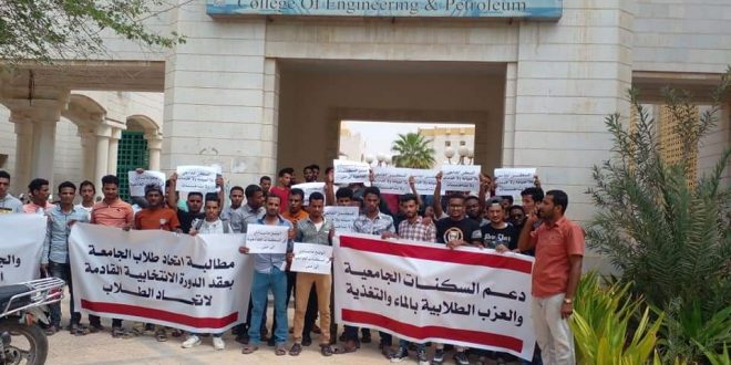 وقفة احتجاجية لطلاب كلية الهندسة والبترول بجامعة حضرموت للمطالبة بتحسين السكنات الجامعية