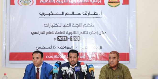 أعلنت وزارة التربية والتعليم، اليوم بالعاصمة المؤقتة عدن، نتائج اختبارات شهادة الثانوية العامة بقسميها العلمي والأدبي للعام الدراسي 2022/2021، بنسبة نجاح بلغت 91.9%.