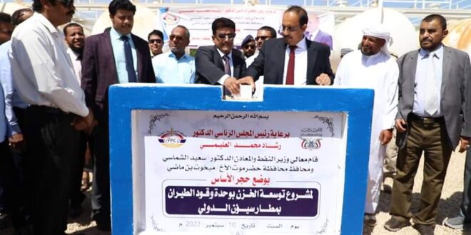 ووضع الوزير والمحافظ، ، يرافقهما عضو مجلس النواب صالح العامري، ووكيل المحافظة سالم بن شرمان، حجر الأساس لمشروع توسعة الخزن بوحدة وقود الطيران بمطار سيئون الدولي، تستوعب أكثر من 500 ألف طن، لمواكبة التطورات وحركة النشاط لمطار سيئون الدولي.