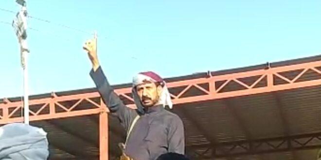 الشيخ عادل بلحامض النهدي أثناء تشييع جنازة الشهيد محمد عبود باحشوان في القطن: