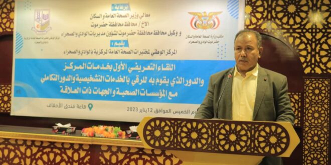 حضر وكيل محافظة حضرموت لشؤون مديريات الوادي والصحراء الاستاذ/ عامر سعيد العامري، اليوم الخميس، اللقاء التعريفي الاول بخدمات المركز والدور الذي يقوم به للرقي بالخدمات التشخيصية، والدور التكاملي مع المؤسسات الصحية والجهات ذات العلاقة، الذي يقيمه المركز الوطني لمختبرات الصحة العامة والمركزية بالوادي والصحراء برعاية من وزير الصحة والسكان والسلطة المحلية.