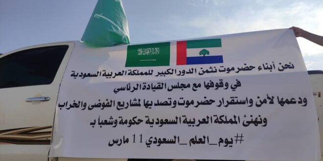 احتفل أبناء وادي حضرموت في مدينة سيئون عصر اليوم السبت بيوم العلم السعودي عبر مسيرات بالسيارت دعا له تجمع أبناء قبائل آل كثير، حيث تم رفع العلم السعودي فيها إلى جانب علم حضرموت تعبيرا عن محبتهم لمملكة الخير والإنسانية وعرفانا بدور المملكة العربية السعودية في دعم مجلس القيادة الرئاسي وحفظ أمن واستقرار المحافظة.