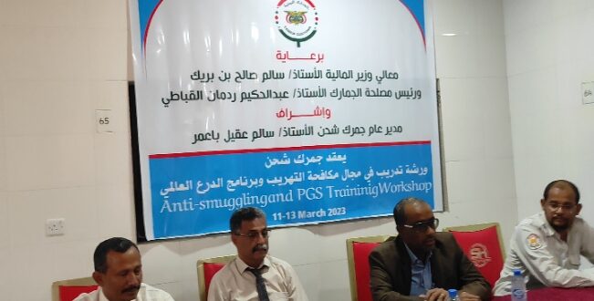 برعاية معالي وزير المالية الاستاذ / سالم بن بريك واشراف ومتابعة رئيس مصلحة الجمارك الأستاذ/ عبدالحكيم ردمان القباطي، دشنت اليوم الورشة التدريبية لموظفي جمرك شحن البري في مجال مكافحة التهريب وبرنامج الدرع العالمي التابع لمنظمة الجمارك العالمي لمراقبة السلائف الكيميائية المستخدمة في صناعة المتفجرات.