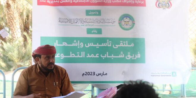 برعاية مكتب الشؤون الإجتماعية والعمل بمديرية عمد وبتمويل من مؤسسة البادية للتنمية والأعمال الإنسانية فرع وادي عمد انعقد يوم السبت 11 مارس 2023م ملتقى تأسيس وإشهار فريق شباب عمد التطوعي بحضور عدد من الشباب والمهتمين بالعمل التطوعي والشبابي.