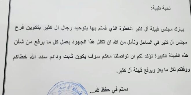 يبارك مجلس قبيلة آل كثير الخطوة الذي قمتم بها بتوحيد رجال آل كثير بتكوين فرع مجلس آل كثير في الساحل ونأمل من الله ان تكلل هذا الجهود بعمل كل ما يرفع من شأن