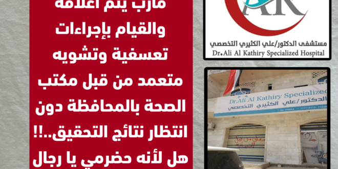 مستشفى الدكتور علي الكثيري التخصصي في مأرب يتم اغلاقه والقيام باجراءات تعسفية وتشويه متعمد من قبل مكتب الصحة بالمحافظة دون انتظار نتائج التحقيق..!!