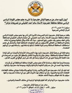 وعليه فإننا في مرجعية قبائل حضرموت نشيد بهذه التصريحات الشجاعة والجبارة من قبل قيادة السلطة المحلية بالمحافظة ، ونعلن مؤازرتنا وتأييدنا الكامل والمطلق لكل ماورد من تصريحات في هذه الكلمة التاريخية آملين في ذات السياق ترجمة كل ذلك على أرض الواقع في القريب العاجل..