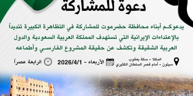 باركت السلطة المحلية بمحافظة حضرموت دعوات القوى والمكونات الحضرمية للاحتشاد والمشاركة في وقفة جماهيرية حاشدة، تعبيرًا عن شكر وامتنان أبناء حضرموت لمواقف الأشقاء في المملكة العربية السعودية، وتجسيدًا للتضامن الكامل معهم إزاء الاعتداءات الإيرانية المتكررة التي تستهدف أمن واستقرار المنطقة، والتنديد بالمشروع الفارسي وأدواته التي تهدد السلم الإقليمي.