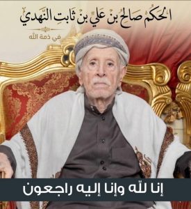 بقلوب مؤمنة بقضاء الله وقدره قلوباً يعتصرها الألم ننعى الحكم صالح بن علي بن ثابت النهدي شيخ شمل قبائل نهد وصوت الحكمة الحضرمية رجل المواقف التى لا تتزحزح في أوقات الشدائد والذي فقد الوطن برحيله قامة وهامة وطنية من الهامات التى يُقاس بهم الثبات وتُستحضر بهم معاني الوفاء والانتماء.