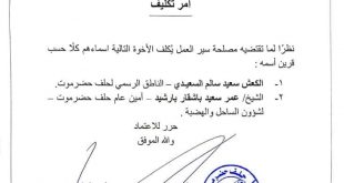 المكلا /١٢ ابريل ٢٠٢٠ أصدر الشيخ عمرو بن حبريش العليي رئيس حلف حضرموت، اليوم “الأحد” قرارًا يقضى بتكليف كلًا من : – الكعش سعيد سالم السعيدي – ناطقًا رسميًا لحلف حضرموت. – الشيخ /عمر سعيد باشقار بارشيد – أمينًا عامًا لحلف حضرموت لشؤون الساحل والهضبة.