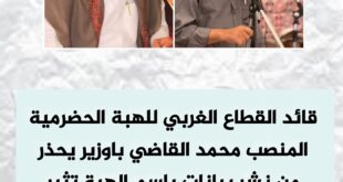 إقرا أكثر »قائد القطاع الغربي للهبة الحضرمية المنصب محمد القاضي باوزير يحذر من نشر بيانات باسم الهبة تثير الفتن بين أبناء حضرموت